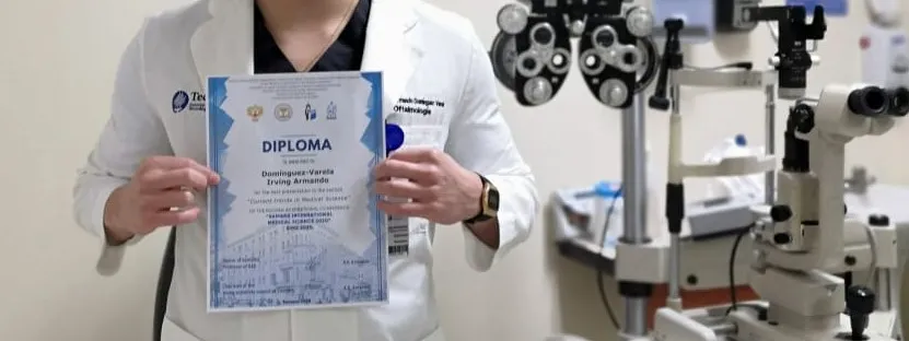 Al rotar en área COVID-19 del Hospital San José, el Dr. Irving Armando Domínguez Varela, residente de Oftalmología de la Escuela de Medicina y Ciencias de la Salud, publicó un artículo de revisión sobre las manifestaciones oculares del COVID-19, que lo llevó a ganar un diploma en Samara, Rusia.