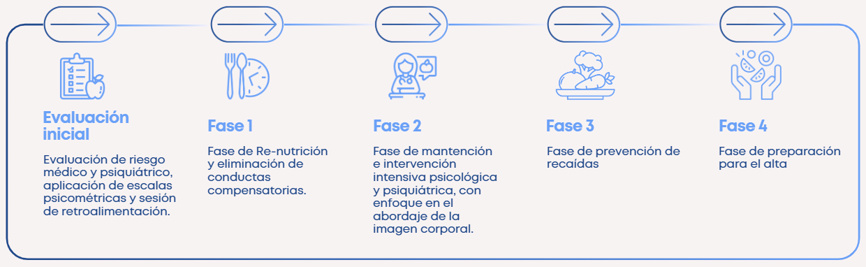 El tratamiento se organiza en distintas etapas, desde la evaluación inicial hasta la preparación para el alta, con un enfoque progresivo y preventivo de recaídas.